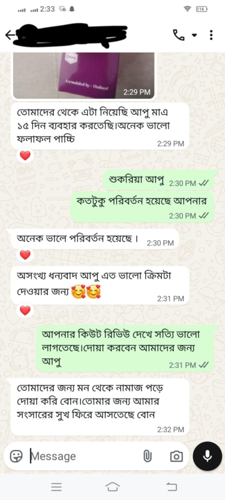 ম্যাম, এটা আপনার বর্তমান অবস্থা এবং ত্বকের ধরণের উপর নির্ভর করে। তবে আমাদের বেশিরভাগ কাস্টমারই ২১-২৮ দিনের মধ্যে পরিবর্তন লক্ষ্য করা শুরু করেন। ভালো এবং স্থায়ী ফলাফলের জন্য একটি পূর্ণ কোর্স (সাধারণত ৩ মাস) সম্পন্ন করার পরামর্শ দিই।